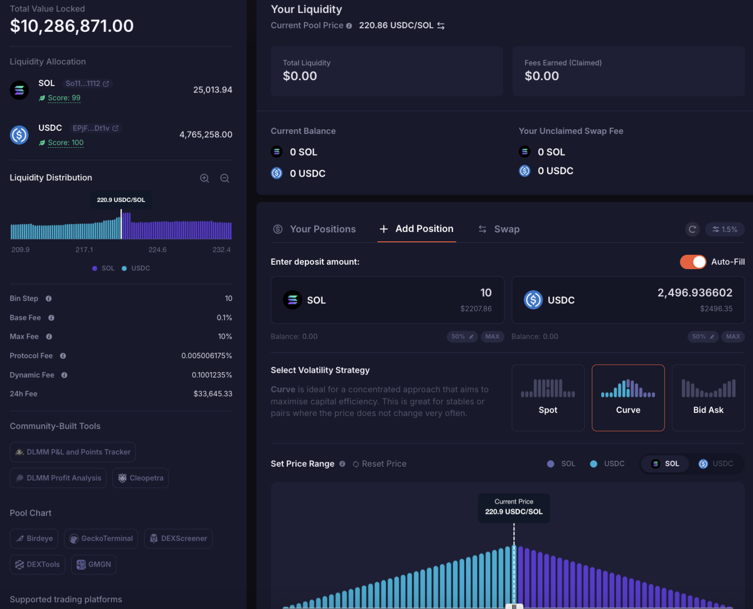 对于用户而言,添加流动性的方式则有三种,Spot、Curve 和 Bid Ask。其中 Spot 和 Curve 均是「平均」分配添加的流动性,但前者是线性平均,后者是曲线平均。Bid Ask 模式则是允许添加单边流动性,例如在 SOL/USDC 池中仅添加 SOL 或 USDC 的流动性。