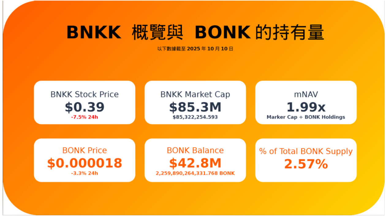 自 2025 年 10 月 10 日(星期五)开盘起,公司将以新名称 Bonk, Inc. 和新股票代码「BNKK」在纳斯达克资本市场开始交易。
