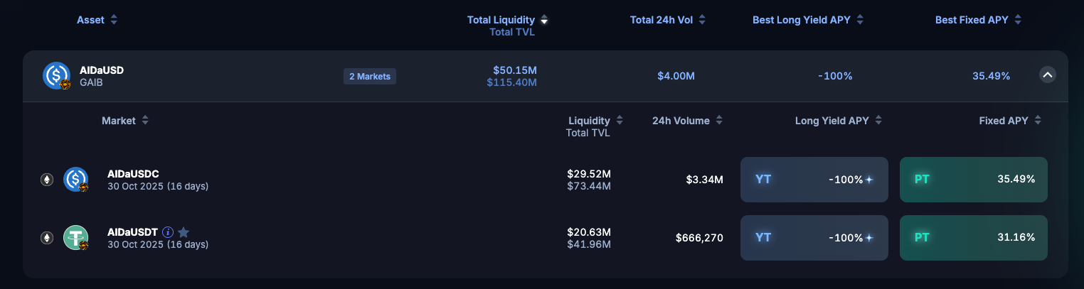 此外,GAIB 已与 Pendle 进行 DeFi 乐高式集成。在 Pendle 上,GAIB 的收益流被拆分并代币化:AIDaUSDC YT 和 AIDaUSDC PT,用户可以进行多种策略操作和博弈。投机型投资者可以购买 YT,通过支付少量成本来博取底层 AI 算力资产未来收益超预期增长带来的高倍回报。保守型投资者通过购买并持有 PT,来锁定一个固定的、无风险的到期收益率,而 AIDaUSDC PT 收益率长期保持在前列。