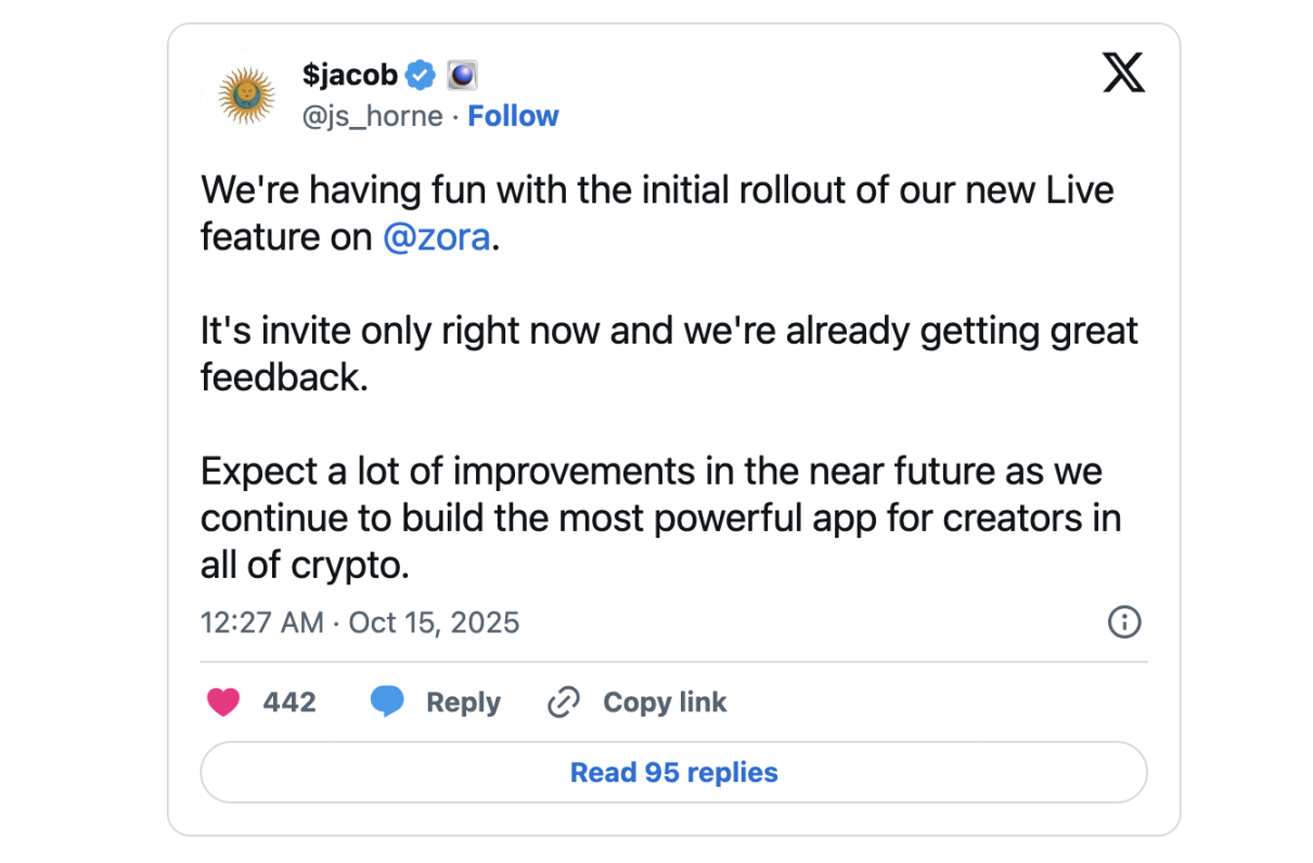 Zora 联合创始人 Jacob Horne 表示,目前直播功能处于测试阶段,仅对受邀用户开放。