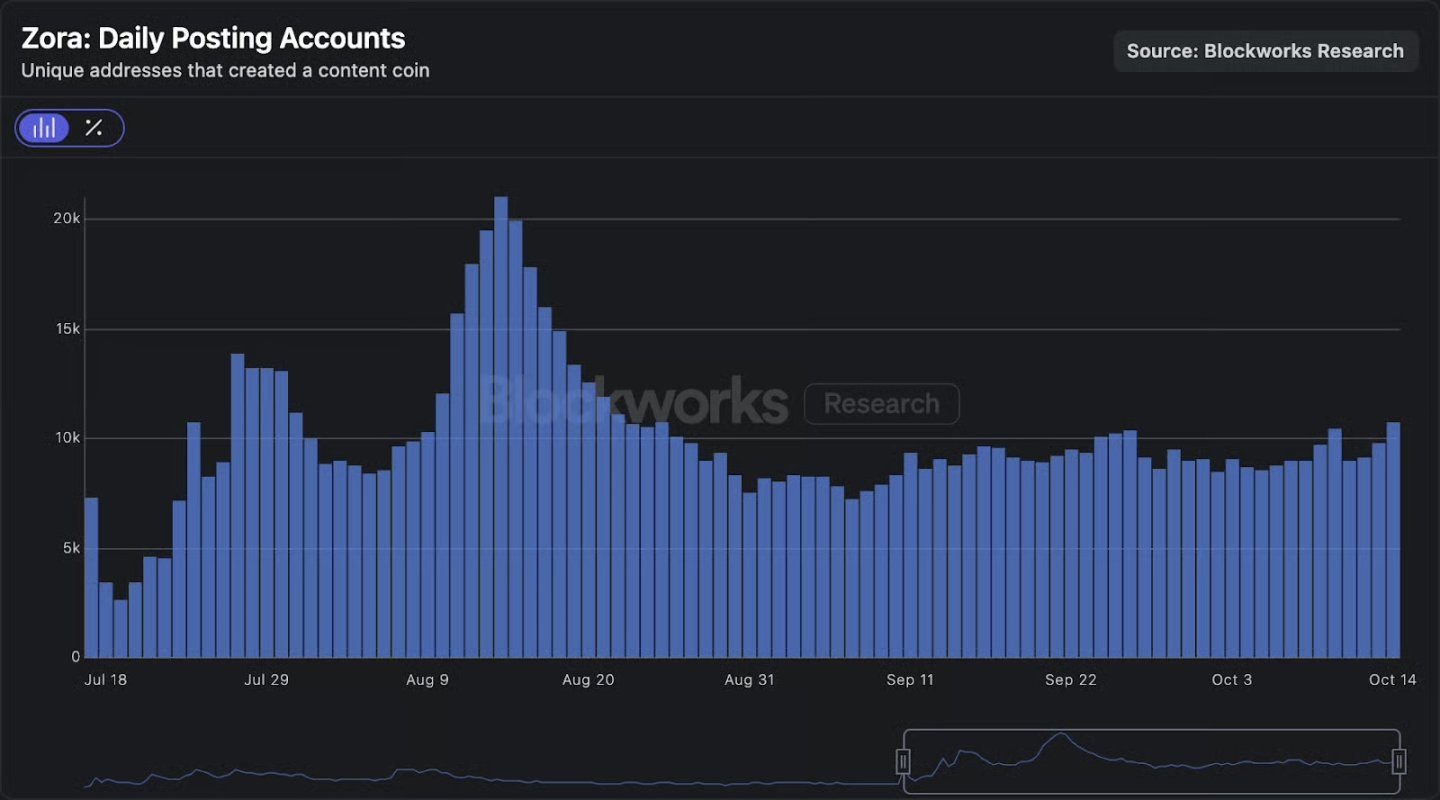 据 Blockworks Research 数据,Zora 平台每天约有 1 万个账户发布内容。这表明其活跃用户基数至少达到该规模,但交易者数量比创作者多多少仍不明确。