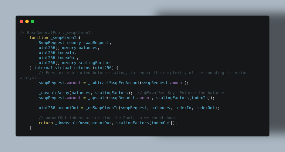 本次攻击的关键问题出在协议处理小额交易的逻辑上。当用户进行小金额交换时,协议会调用_upscaleArray 函数,该函数使用 mulDown 进行数值向下舍入。一旦交易中的余额与输入金额同时处于特定舍入边界(例如 8-9 wei 区间),就会产生明显的相对精度误差。