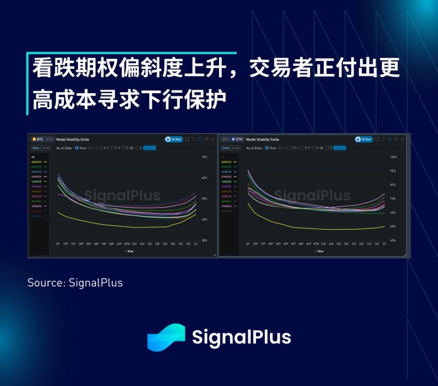 随著交易者为短期内价格进一步下跌做准备,比特币和乙太坊的看跌期权偏斜度重新上升。我们持同样谨慎的态度,如果看到比特币再次向下测试 10 万美元关口(许多代币价格已跌破其 10 月 10 日低点),也不会感到意外,这或许是由美股的疲软或负面头条风险所驱动。