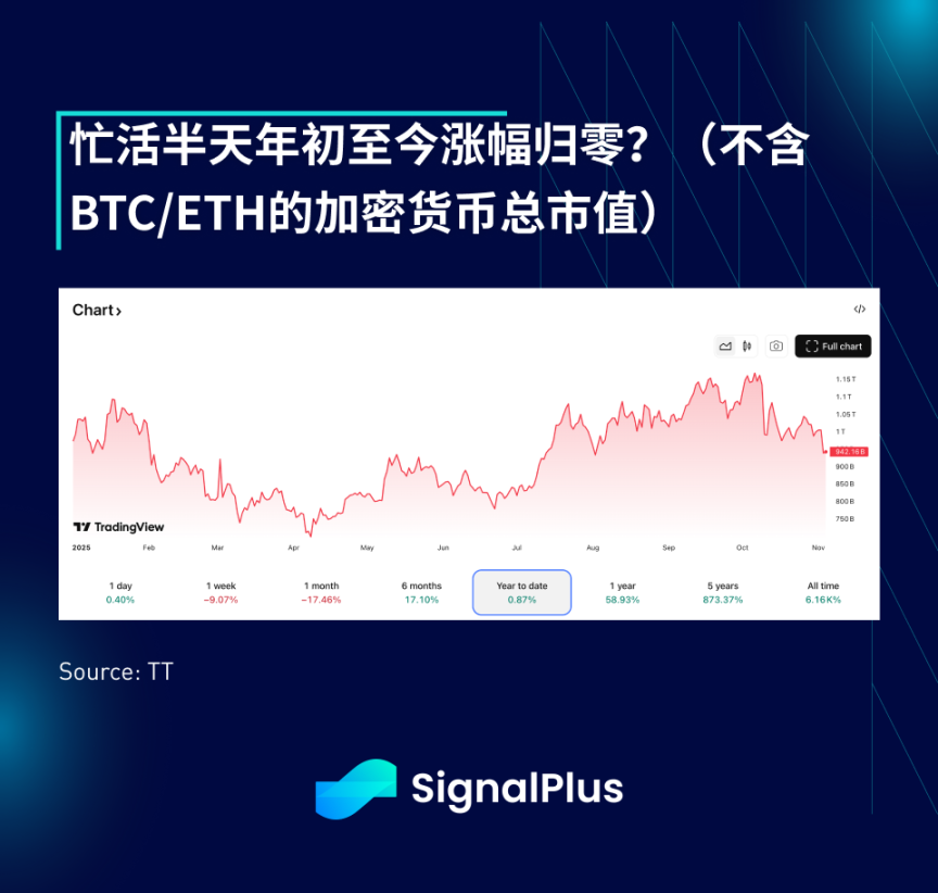 抛售之后,TOTAL3(不含 BTC/ETH)市值现已回吐年初至今的所有涨幅,归于持平,而其他主要宏观资产类别均实现了两位数的增长。包含比特币在内的总市值年初至今的表现也逊于所有主要股票指数(包括中国股市),这确实全面打击了那些期待山寨币复苏的交易者的情绪。