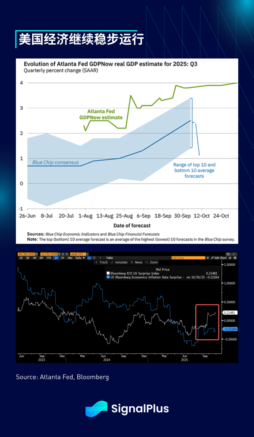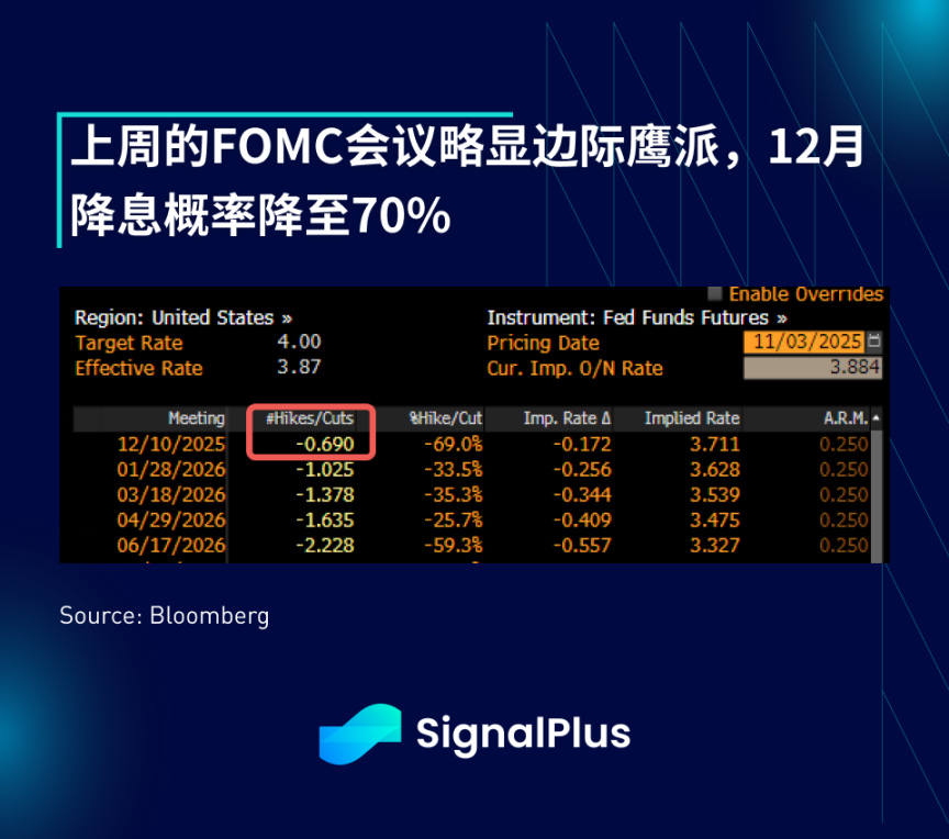 尽管美国政府仍处于停摆状态,上周的主要事件集中在联邦公开市场委员会会议上。会议结果令市场鸽派失望,因为鲍威尔反驳了已完全被市场定价的 12 月降息,称其”远非””既定事实”。尽管降息 25 个基点,鲍威尔指出委员会内部存在”强烈分歧的观点”,大约半数委员支持在第四季度累计降息 75 个基点,而另一半则持反对意见。此外,政府停摆使得经济预测比往常更加困难,美联储甚至暗示他们可能会”保持谨慎”,等待 12 月会议之后,再判断是否需要进行进一步的降息。