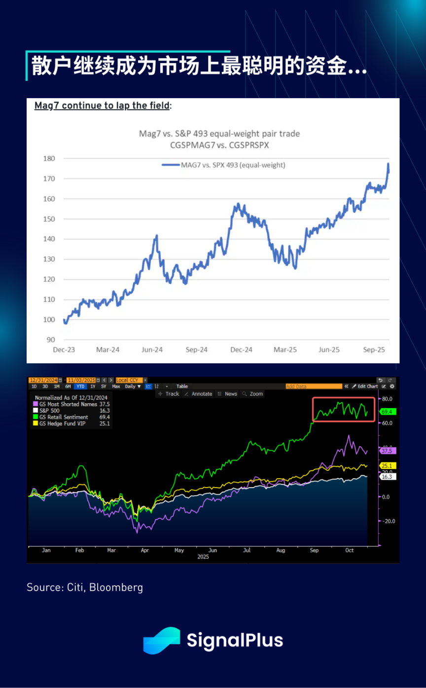 尽管遭遇小幅挫折,但在财报季来临之际,整体市场情绪依然乐观,韩国和日本的 EM 股票在英伟达和半导体板块表现的带动下领涨。”瑰丽七股”继续引领市场,两年期表现跑赢基准 70%,”散户青睐”股票篮子年初至今的表现也几乎超过了所有策略。