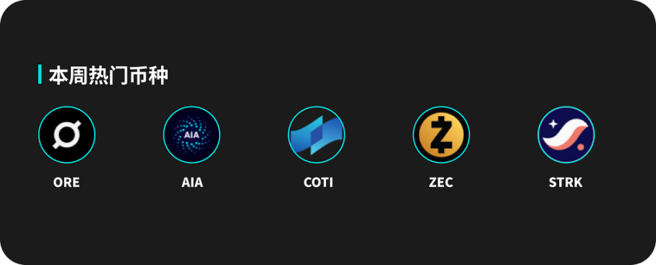 热门币种方面,QRE、AIA、COTI、ZEC 和 STRK 都有着不俗的表现。QRE 本周价格上涨 334%。AIA 价格上涨 229.9%。COTI 价格上涨 15.3%,24 小时交易量 424.33M。TAO 和 ZEC 本周分别上涨 12.5% 和 8.9%。
