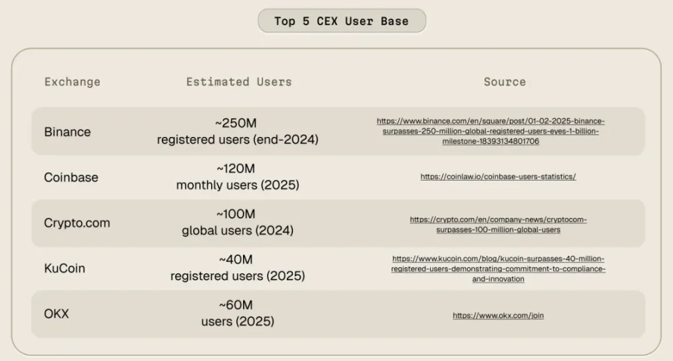 最后按公开注册用户量排序的前五大交易所:Binance、Coinbase、Crypto.com、KuCoin 与 OKX。公开数据显示,五家交易所注册账户总和超过 5 亿。然而,大量用户在多家平台重复开户,导致数字虚高。为得出贴近现实的「真人」基数,我们采用保守调整:假设重复账户占比约 55–60%,据此测算五大所独特用户规模约为 2.0–2.3 亿人。