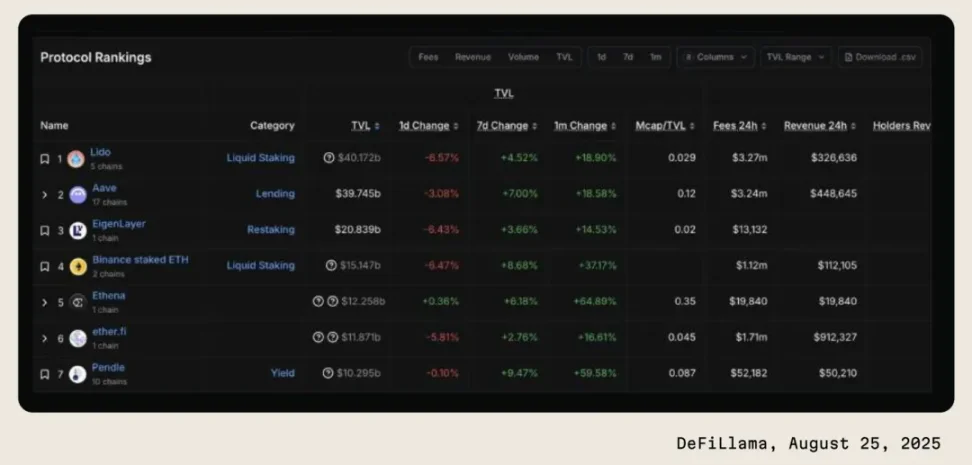 为看清当前 DeFi 活动的主战场,我们锁定按 TVL 排序的前五大「可收益」协议(涵盖质押、借贷、流动性挖矿)。虽然市面上还有数百个颇具声量的项目,但这五家已囊括绝大部分资金与参与者,足以给出数量级可靠的估算。