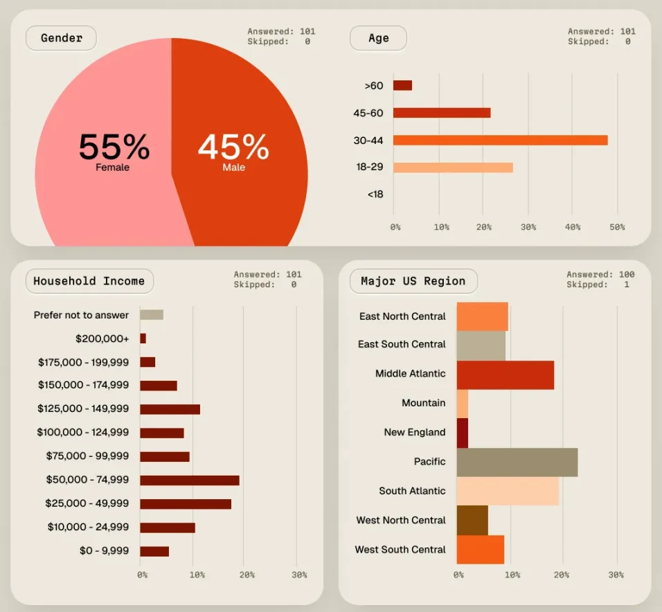 本次调研面向美国普通零售人群,年龄跨度 18–99 岁,覆盖所有收入层级。在 150 份有效样本中,约三分之二(67%)曾持有并使用过加密资产,三分之一(33%)从未接触。为确保结论聚焦于「真实行为」,我们仅对「已入圈」的 101 位活跃持币者进行深入分析,从而剔除零经验噪音。