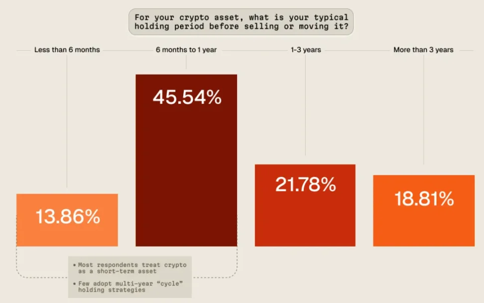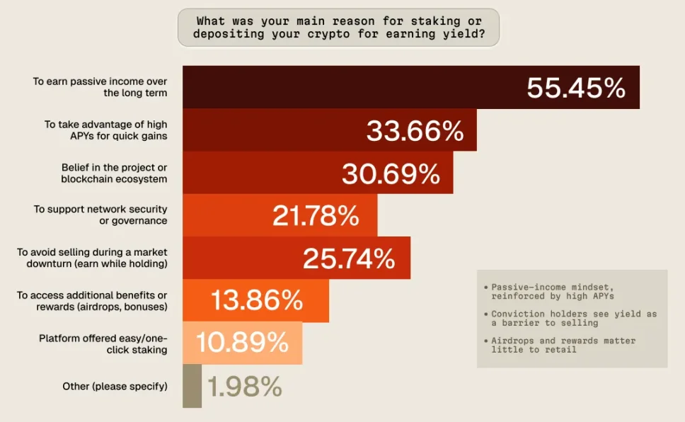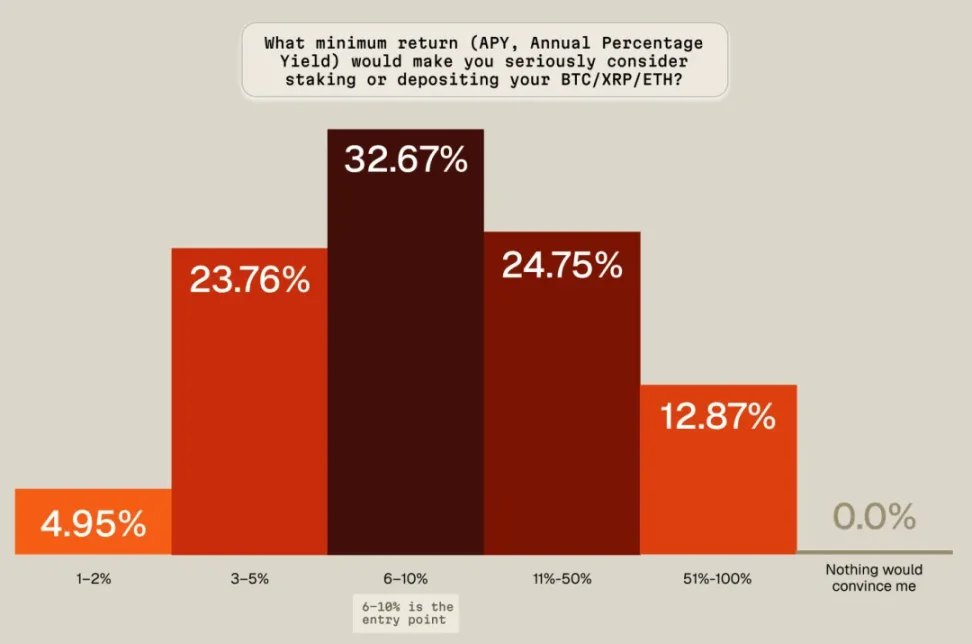 调研显示,散户在收益决策上普遍保守且短视:60% 以上持有加密资产不足一年,只有远高于传统理财的收益才能让他们挪窝——6% 年化是「最低吸引力阈值」,个位数 APY 很难打动人。