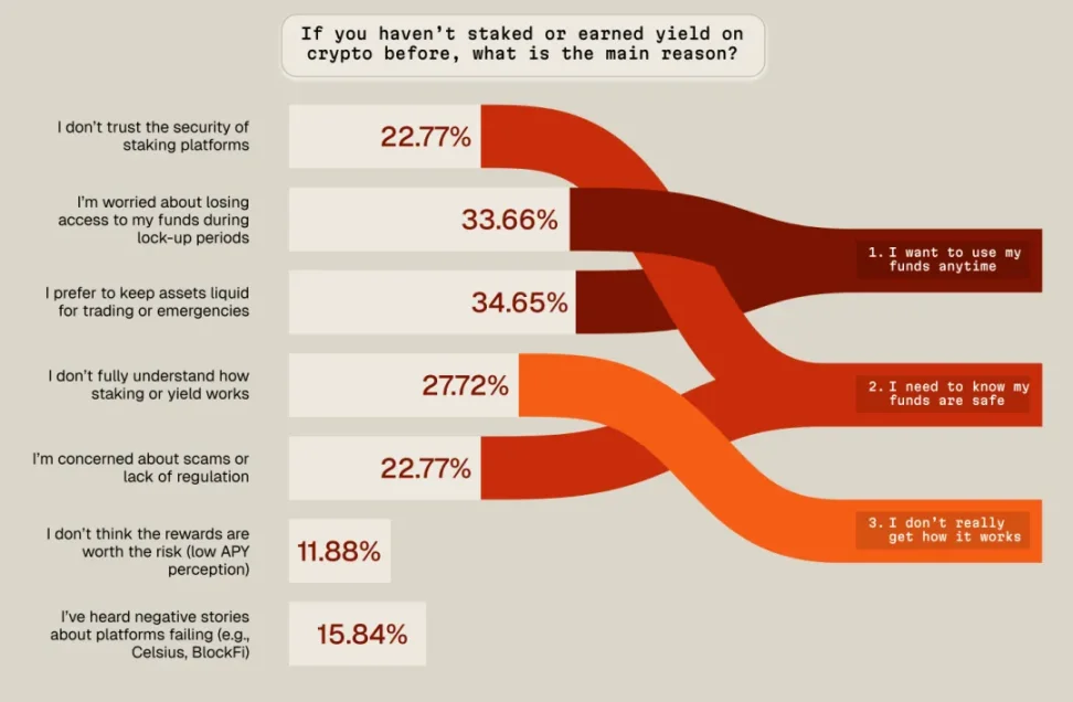 散户依旧谨慎:他们要求随时可提、收益必须高于传统理财,并把安全置于收益之前。多数人对个位数 APY 无动于衷,6% 以上才值得搬钱。
