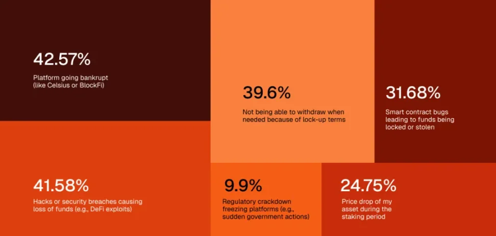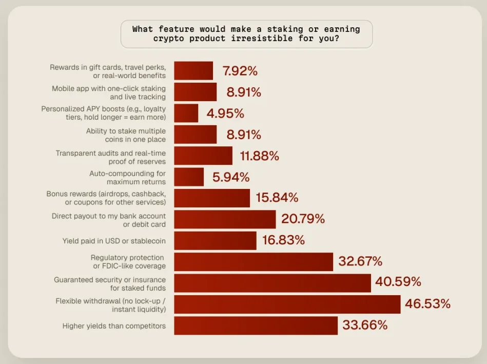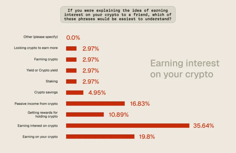 语言决定理解门槛。当受访散户被问及哪种表述最易懂时,压倒性胜出的是:「用你的加密货币赚利息(earning interest on your crypto)。」——它直接对标银行储蓄,无需额外技术背景。