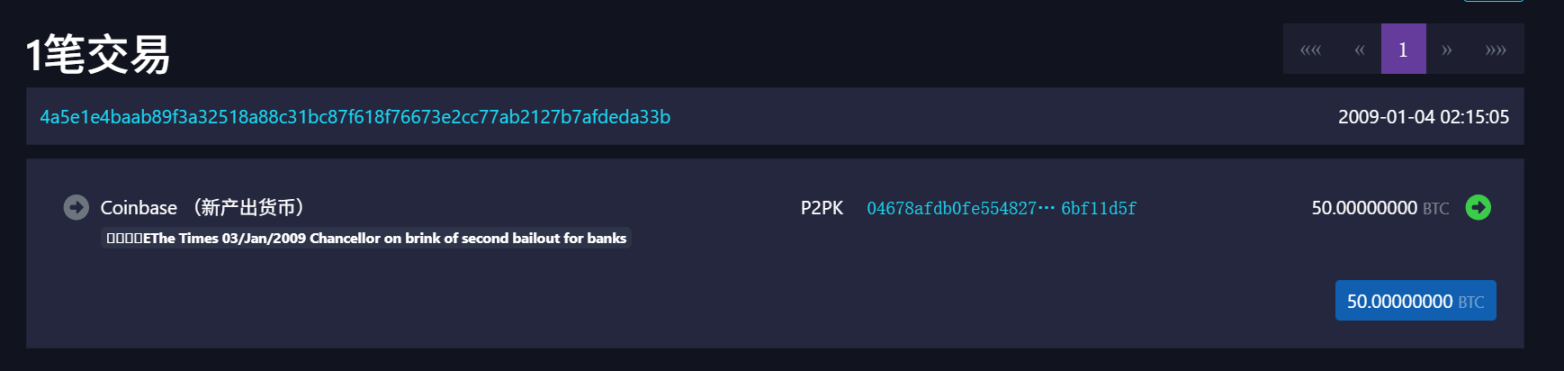 2009 年 1 月 3 日,第一枚比特币被挖出时,中本聪在第一个区块上留下一段文字: