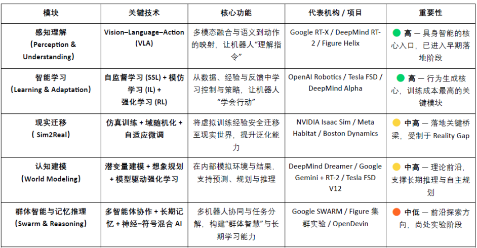 具身智能的核心技术体系可视为一个自下而上的智能栈:VLA(感知融合)、RL/IL/SSL(智能学习)、Sim2Real(现实迁移)、World Model(认知建模)、以及多智能体协作与记忆推理(Swarm & Reasoning)。其中,VLA 与 RL/IL/SSL 是具身智能的「发动机」,决定其落地与商业化;Sim2Real 与 World Model 是连接虚拟训练与现实执行的关键技术;多智能体协作与记忆推理则代表更高层次的群体与元认知演化。