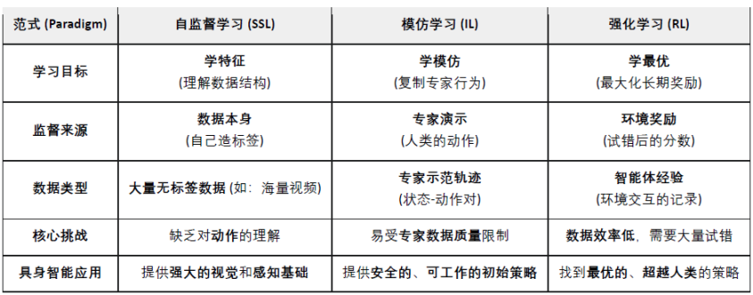 在 具身智能(Embodied AI) 中,自监督学习(SSL) 旨在让机器人通过感知数据预测状态变化与物理规律,从而理解世界的因果结构;强化学习(RL) 是智能形成的核心引擎,通过与环境交互和基于奖励信号的试错优化,驱动机器人掌握行走、抓取、避障等复杂行为;模仿学习(IL) 则通过人类示范加速这一过程,使机器人快速获得行动先验。当前主流方向是将三者结合,构建层次化学习框架:SSL 提供表征基础,IL 赋予人类先验,RL 驱动策略优化,以平衡效率与稳定性,共同构成具身智能从理解到行动的核心机制。