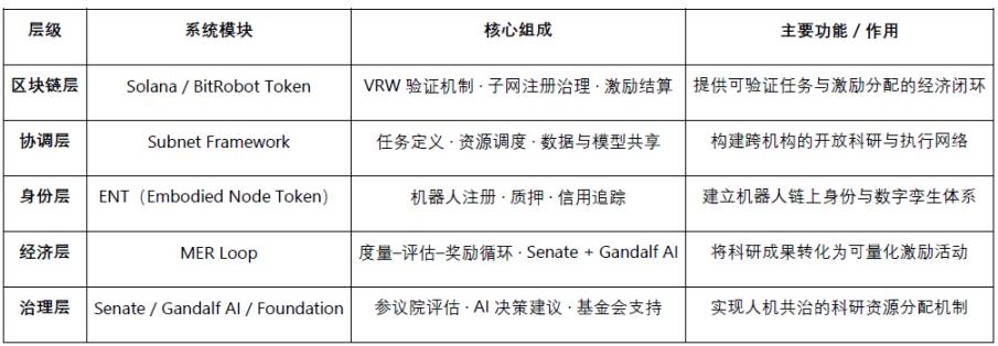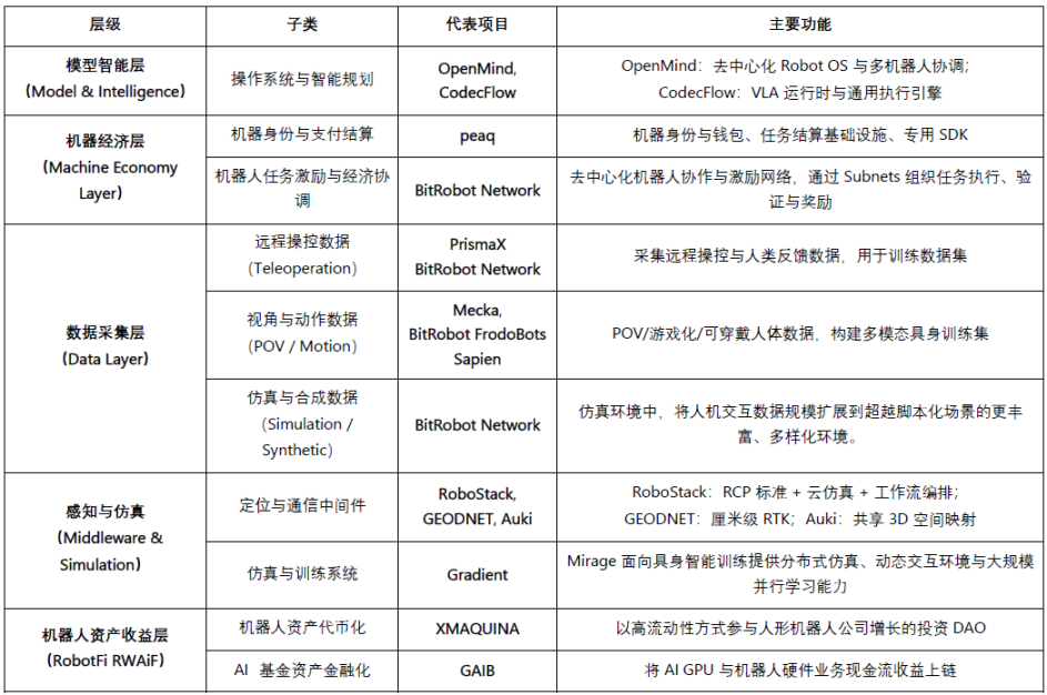 基于「可验证进展、技术公开度、产业相关度」三项标准,梳理当前 Web3 × Robotics 代表性项目,并按五层架构归类:模型智能层、机器经济层、数据采集层、感知与仿真基础层、机器人资产收益层。为保持客观,我们已剔除明显「蹭热点」或资料不足项目;如有疏漏,欢迎指正。