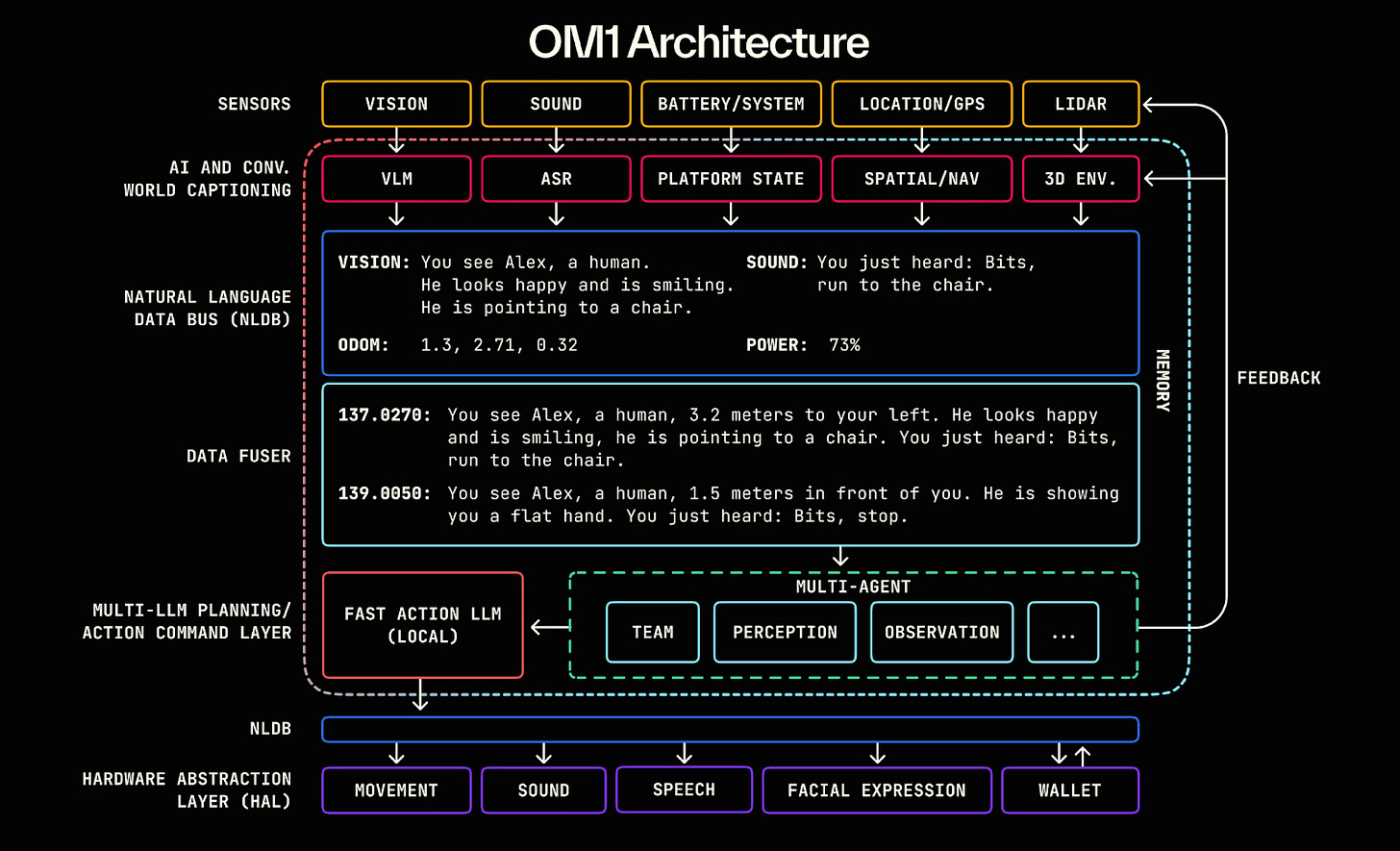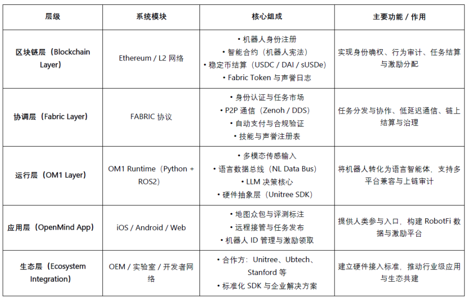OpenMind 处于「技术可运行、商业未落地」的早期阶段。核心系统 OM1 Runtime 已在 GitHub 开源,可在多平台运行并支持多模态输入,通过自然语言数据总线(NLDB)实现语言到行动的任务理解,具备较高原创性但仍偏实验,Fabric 网络 与链上结算仅完成接口层设计。