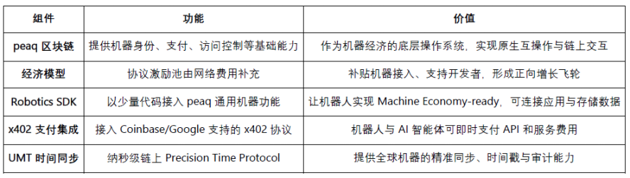 peaq 是专为机器经济打造的 Layer-1 区块链,为数百万台机器人与设备提供机器身份、链上钱包、访问控制以及纳秒级时间同步(Universal Machine Time)等底层能力。其 Robotics SDK 使开发者能够以极少代码让机器人「机器经济就绪」,实现跨厂商、跨系统的互操作性与交互。
