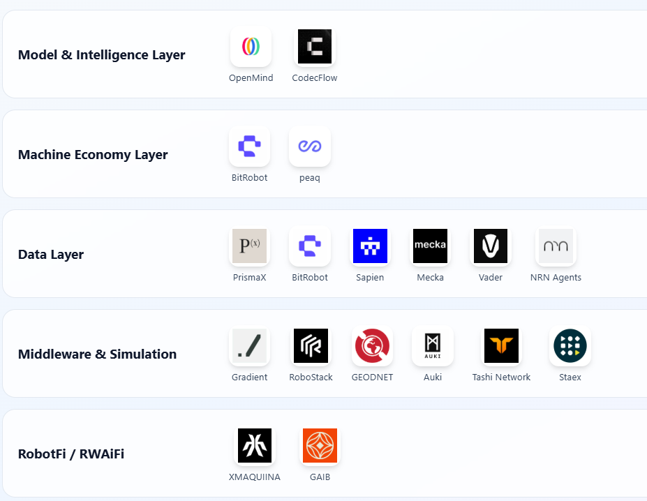 这一层聚焦于将机器人从「生产性工具」转化为「可金融化资产」的关键环节,通过 资产代币化、收益分配与去中心化治理,构建机器经济的金融基础设施。代表项目包括: