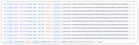 在闪电贷回调函数中将借出的 ETH 用 1100 ETH 存入 Tornado.Cash: 100 ETH 混币,随后借助 Tornado.Cash: 100 ETHwithdraw 函数取款 100 ETH 到恶意合约 0x3e8e7533dcf69c698Cf806C3DB22f7f10B9B0b97 并触发其 fallback 函数。
