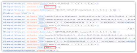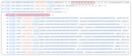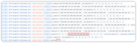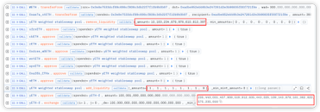 在 fallack 函数中,可以看到下图最后一笔 exchange 与下一步 remove_liquidity 数值一致,可以推断前面的步骤都是为了将闪电贷得到的资产都通过 exchange 等操作兑换成大量的 yETH weighted stableswap pool 的 LP 代币,为后续攻击做准备。
