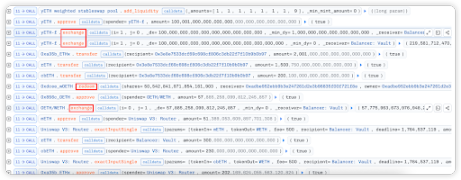 通过如上方式注入单边资产并提取池中代币的方式人为地扩大池子中 rETH、w0ETH 和 mETH 和其他代币的数量差距。