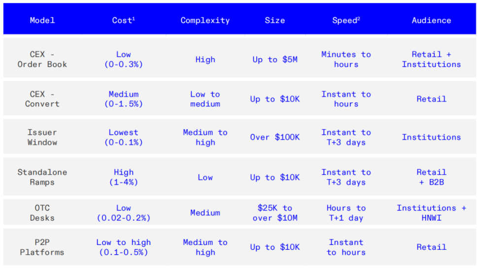 六种出入金模式服务于不同用户群体:中心化交易所(CEX)订单簿模式(低成本,复杂)、CEX 转换模式(更简单,但价格更高)、发行方窗口(最便宜,面向机构)、独立出入金通道(优质用户体验)、场外交易(OTC)柜台(价差小,大额交易),以及点对点(P2P)模式(变化大,长尾市场)。