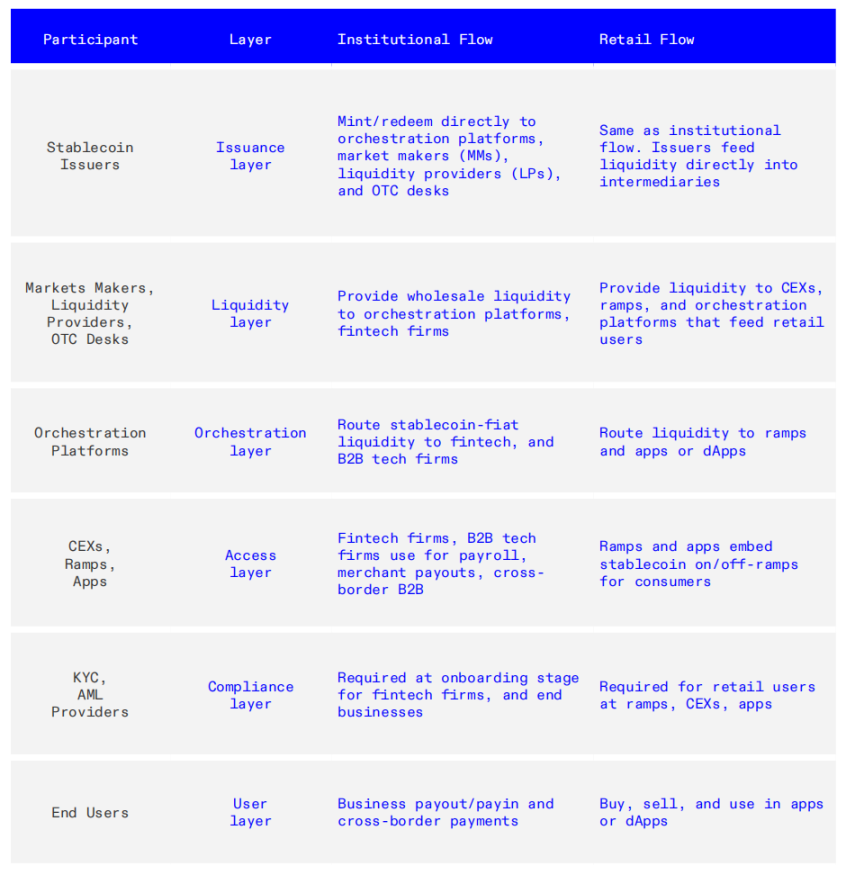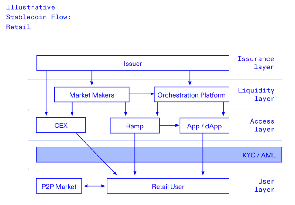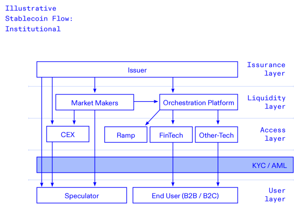根据参与者的规模和用例,稳定币发行方可能会与流动性层、编排协调层和接入层的参与者进行互动。