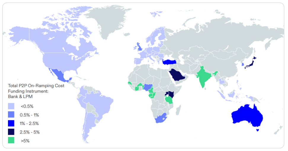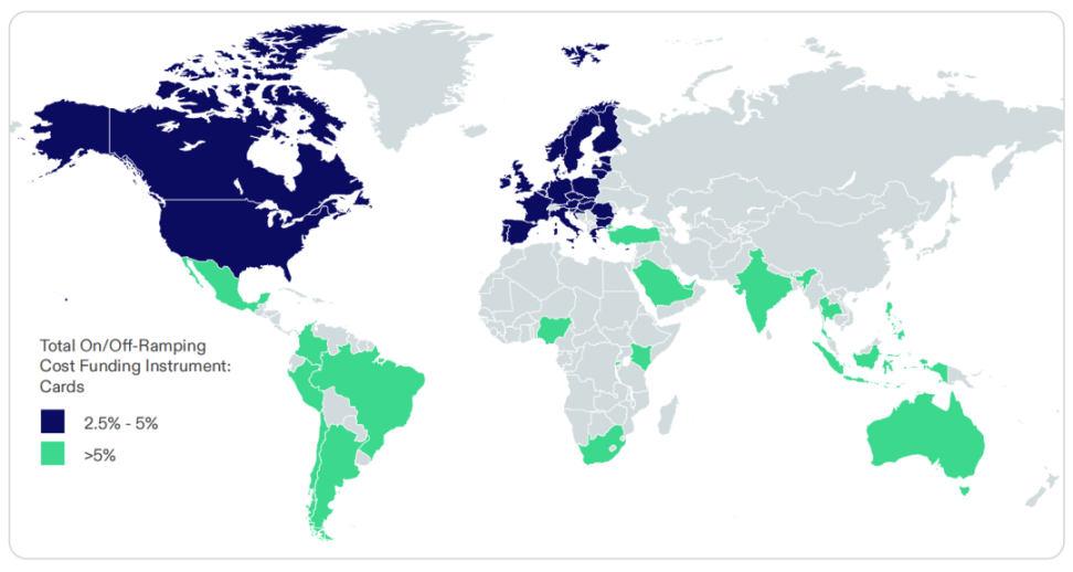在美国、欧盟和英国,通过银行账户在交易所进行出入金或直接出入金的成本为 0-0.3%。在发达市场,基于银行卡的出入金成本为 3-5%,而在许多新兴市场则高达 7-10%。在拉丁美洲和东南亚,点对点(P2P)市场的出入金成本最低,约为 0.5%,但在其他地区则高度不稳定。在非洲,出入金成本通常在低端为 4-6%,最高可达 15-20%。