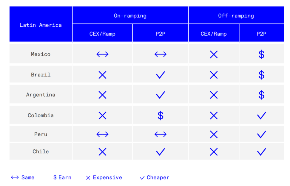 成本正在压缩。在美国、欧盟和英国,中心化交易所或直接出入金通道通常定价在 0-0.3%。在这些市场之外,存在成本与便捷性的权衡。在拉丁美洲和东南亚,全包成本约为 0.5% 的情况很常见,但用户通常依赖 P2P 市场或中心化交易所来达到这些价格。