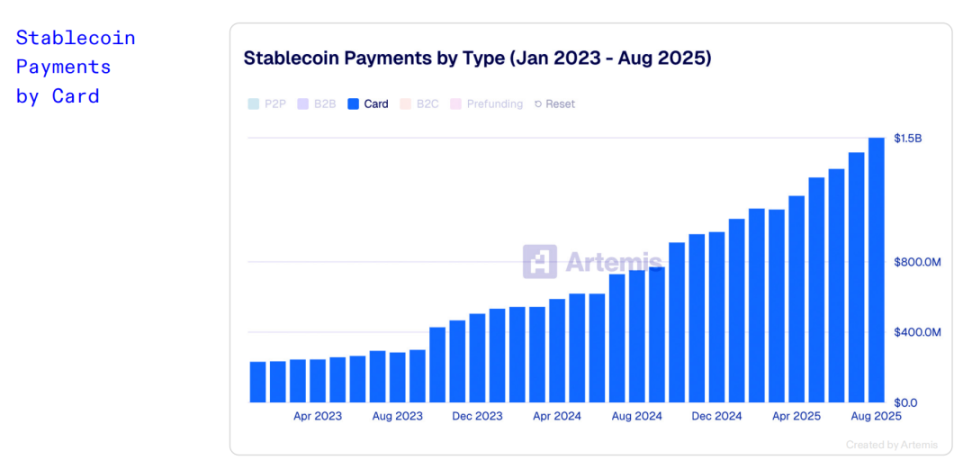 稳定币已成为跨境支付的常见渠道,无论是在汇款还是 B2B 资金流动中都有应用。Artemis 的一项研究发现,受调查公司的 B2B 月交易量在过去两年内增长了约 24 倍,从大约 1.2 亿美元增长到约 30 亿美元。在消费者汇款中也出现了类似的趋势。