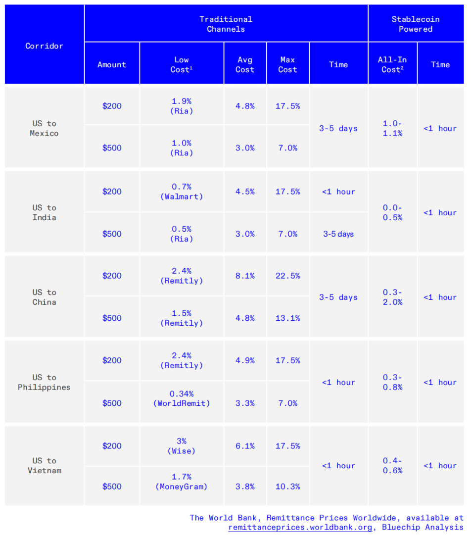 在审查的五个主要通道中,稳定币转账通常比传统平均成本低 50-90%,比最低列出的提供商低 20-70%。
