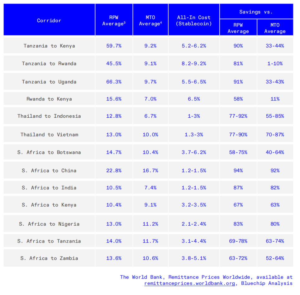 高成本的起源通道(例如,坦桑尼亚→肯尼亚、南非→中国)与世界银行的价格平均值相比节省了 60-94%,即使与低成本的汇款运营商相比也有显著的收益。