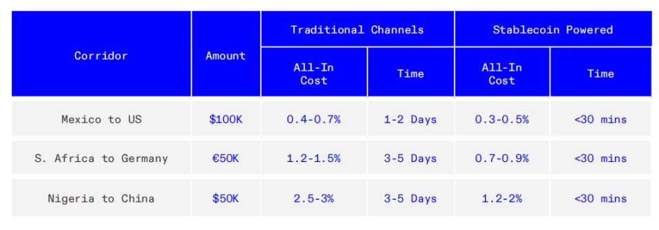 在外汇价差较小的成熟通道中,稳定币并不总是最便宜的。但它们仍然将结算时间从几天缩短到几分钟。在金融服务不足的通道上,稳定币通常在成本和速度方面都占据优势。