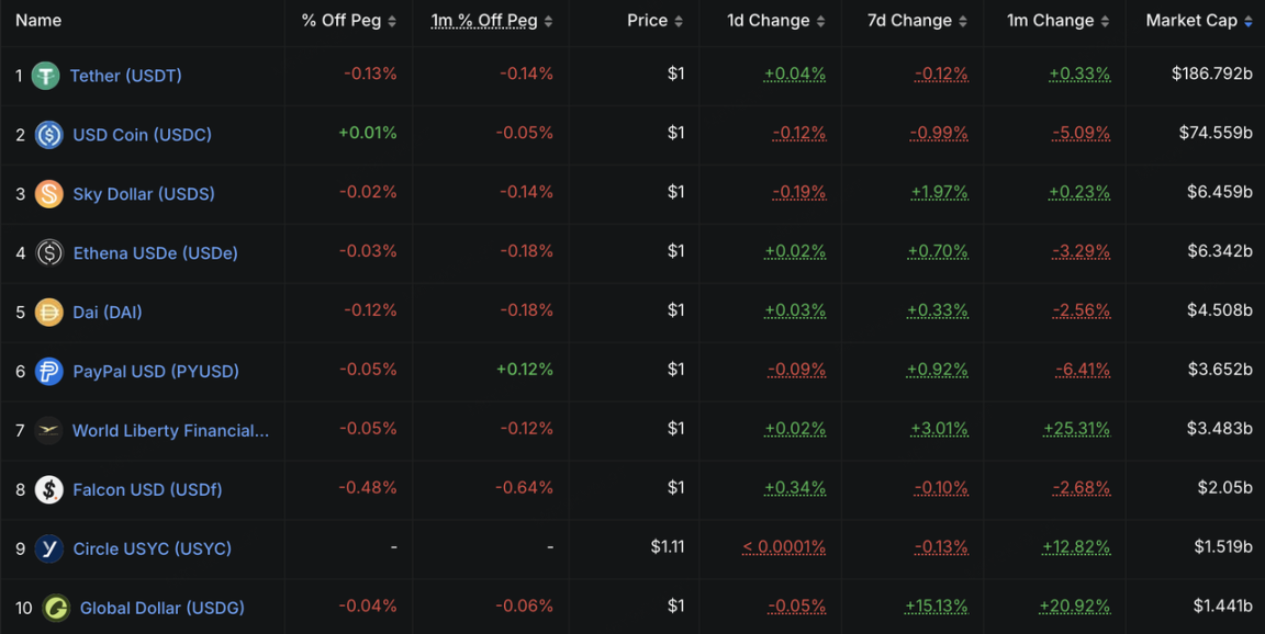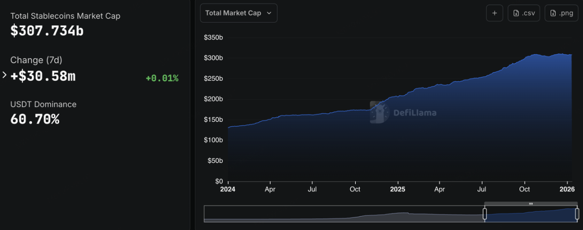 本周稳定币总市值录得约 3,080 亿美元,环比较上周微增 0.01%,整体处于高位筑底阶段。其中,USDT 市值达 1,867.92 亿美元,以 60.70% 的占有率稳居统治地位。相比之下,USDC 单月市值缩水 5.09%,显示出合规资金在宏观不确定性下的审慎态度。 结构上,资金正向收益与合规并重的资产流转。Global Dollar (USDG) 与 Circle USYC 单月市值分别激增 20.92% 与 12.82%。这反映出在利率预期反复的背景下,投资者更青睐具有利息回报或强背书的新兴品种。整体链上“弹药”依然充足,资金多处于持币观望状态。