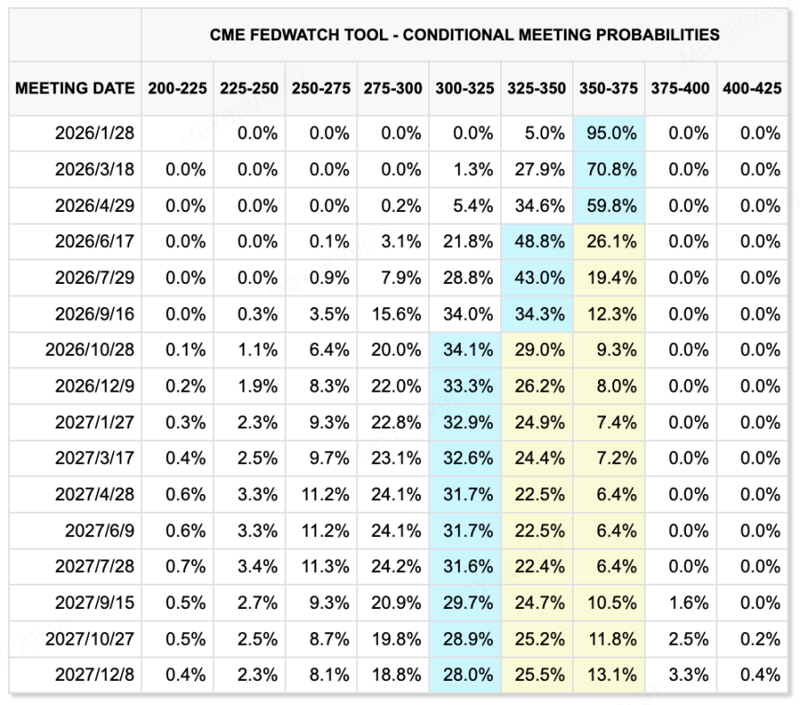 根据最新 CME FedWatch 数据显示,市场对美联储 1 月议息会议维持当前利率不变的预期已达成高度共识,概率攀升至 95.0%。此前非农失业率的意外下行及薪资粘性,基本宣告了短期紧急降息窗口的关闭。目前,市场定价的第一个实质性降息节点已后移至 3 月,届时降息 25bp 的概率定价为 27.9%,而维持现状仍是 70.8% 的主流预期。