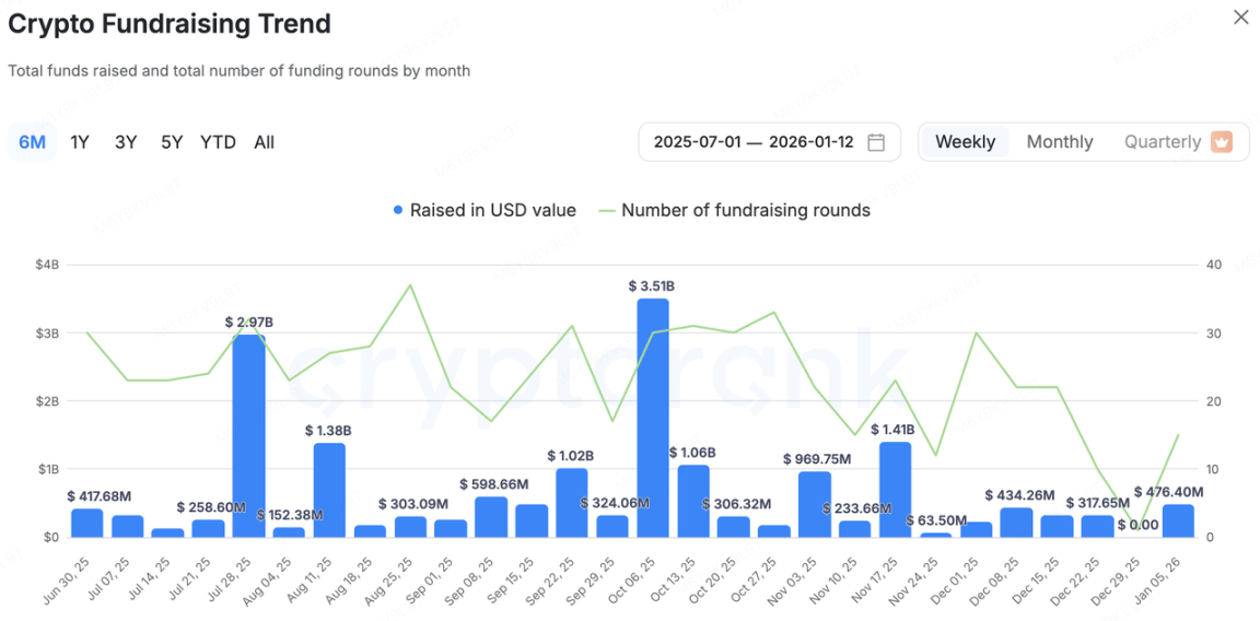 本周加密货币原生一级市场活跃度显著回暖。根据 CryptoRank 统计,1 月 5 日至 12 日当周,市场共披露融资事件超过 10 起,融资总额达 4.76 亿美元。相较于去年 12 月底的沉寂,年初资金进场节奏明显加快,且单笔融资规模有所放大,显示机构投资者在 2026 年初已启动新一轮的资产配置。