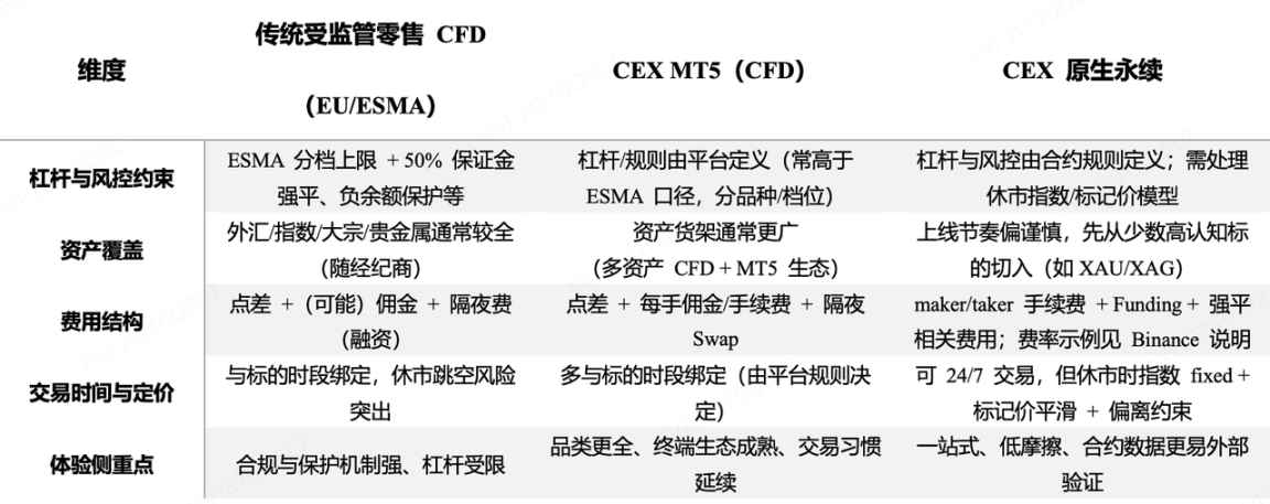 从平台与用户分层的角度看,原生永续更像交易所体系内“直接上架”的衍生品品类:交易、风控与用户行为沉淀在自家合约生态里,便于与既有的保证金体系、做市与量化接口协同;而 MT5/CFD 更像一条“经纪化接入”的增量业务线,上线快、扩品广,更利于覆盖传统 FX/CFD 用户并快速做大品种矩阵。对零售用户而言,原生永续的优势在“一站式、低摩擦、数据更易核验”,MT5/CFD 的优势在“品类更全、终端生态成熟、交易习惯延续”。