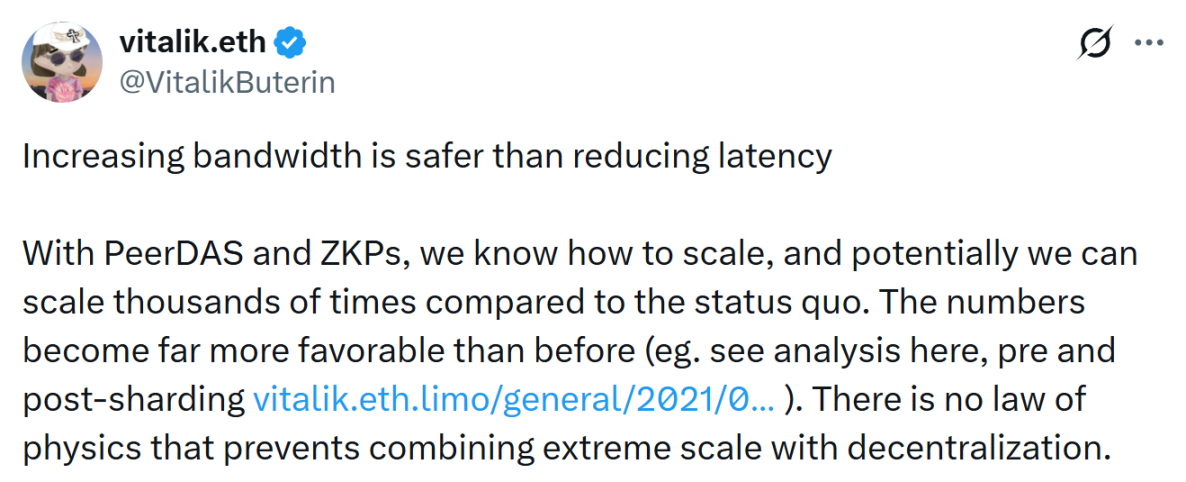 然而站在 2026 年初的时间点回望,我们会发现它似乎正在逐步变为一个可以通过技术进化来跨越的「设计门槛」,正如 1 月 8 日 Vitalik Buterin 指出的颠覆性观点:「相比降低延迟,提升带宽更安全可靠,借助 PeerDAS 与 ZKP,以太坊扩展性可提升数千倍,且与去中心化并不冲突」。