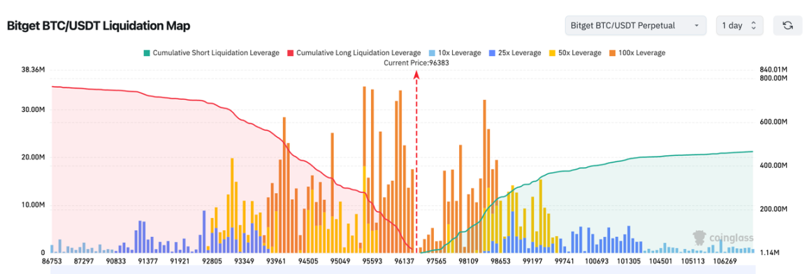 3、Bitget BTC/USDT 清算地图显示:当前价格附近(约 96,000 美元)上下两侧都存在明显的清算密集区,其中上方多空高杠杆(尤其 50x、100x)清算柱更集中,暗示一旦上破,容易触发空头挤压式拉升。而下方则累积了较大规模的 多头清算风险,若价格失守当前区间,可能引发 连锁下跌与快速放量回撤。