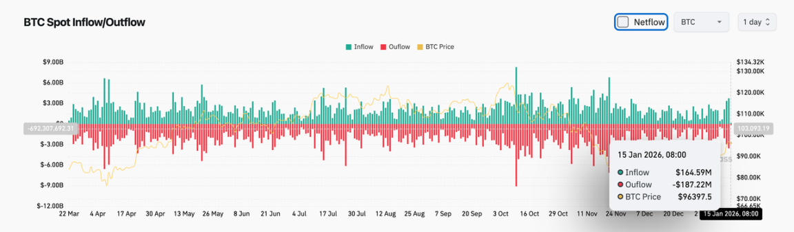 4、过去 24 小时内,BTC 现货流入约 1.64 亿美元,流出约 1.87 亿美元,净流入 -0.23 亿美元。