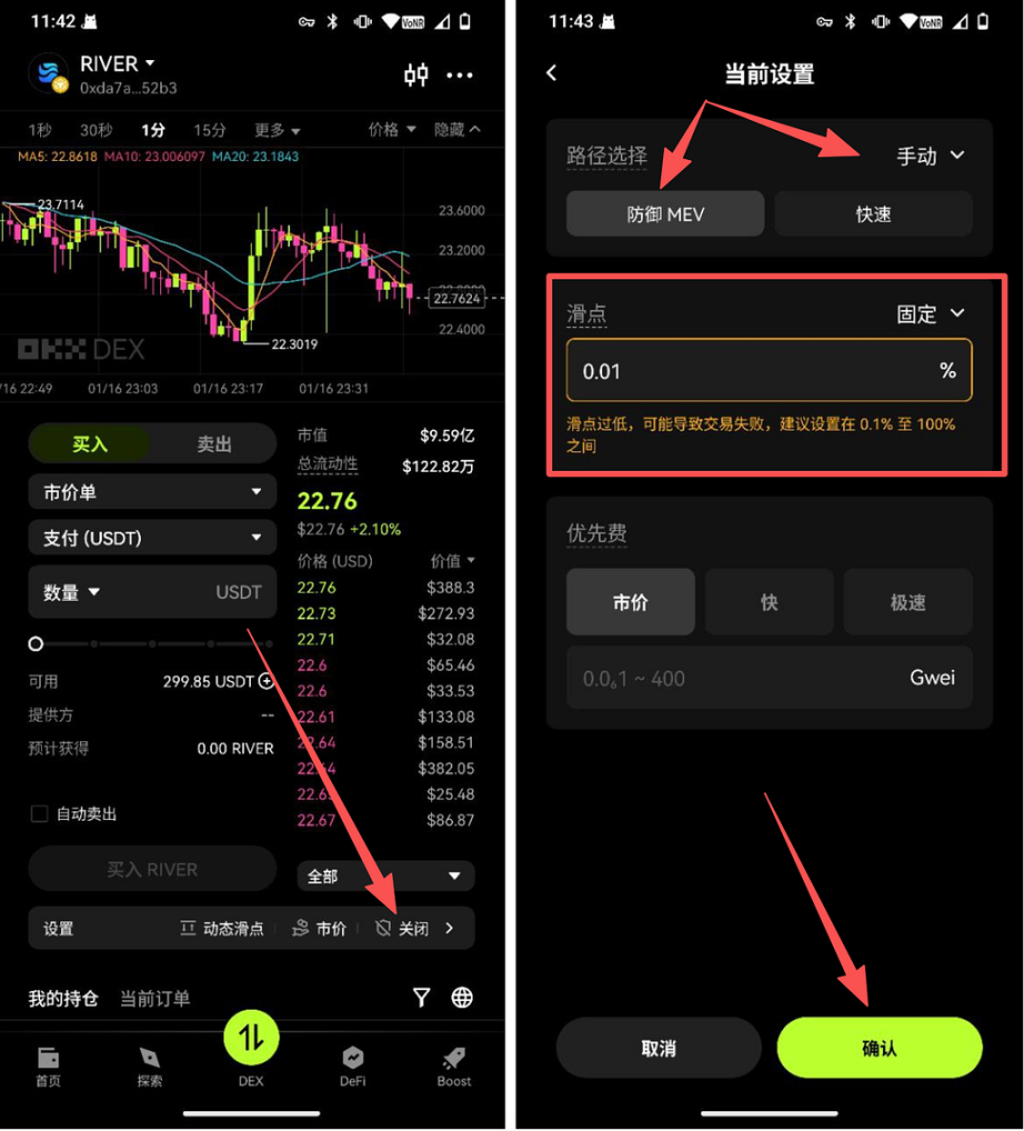 由于划点设置为最低,所以有可能会出现交易失败,多试几次或稍加划点即可。