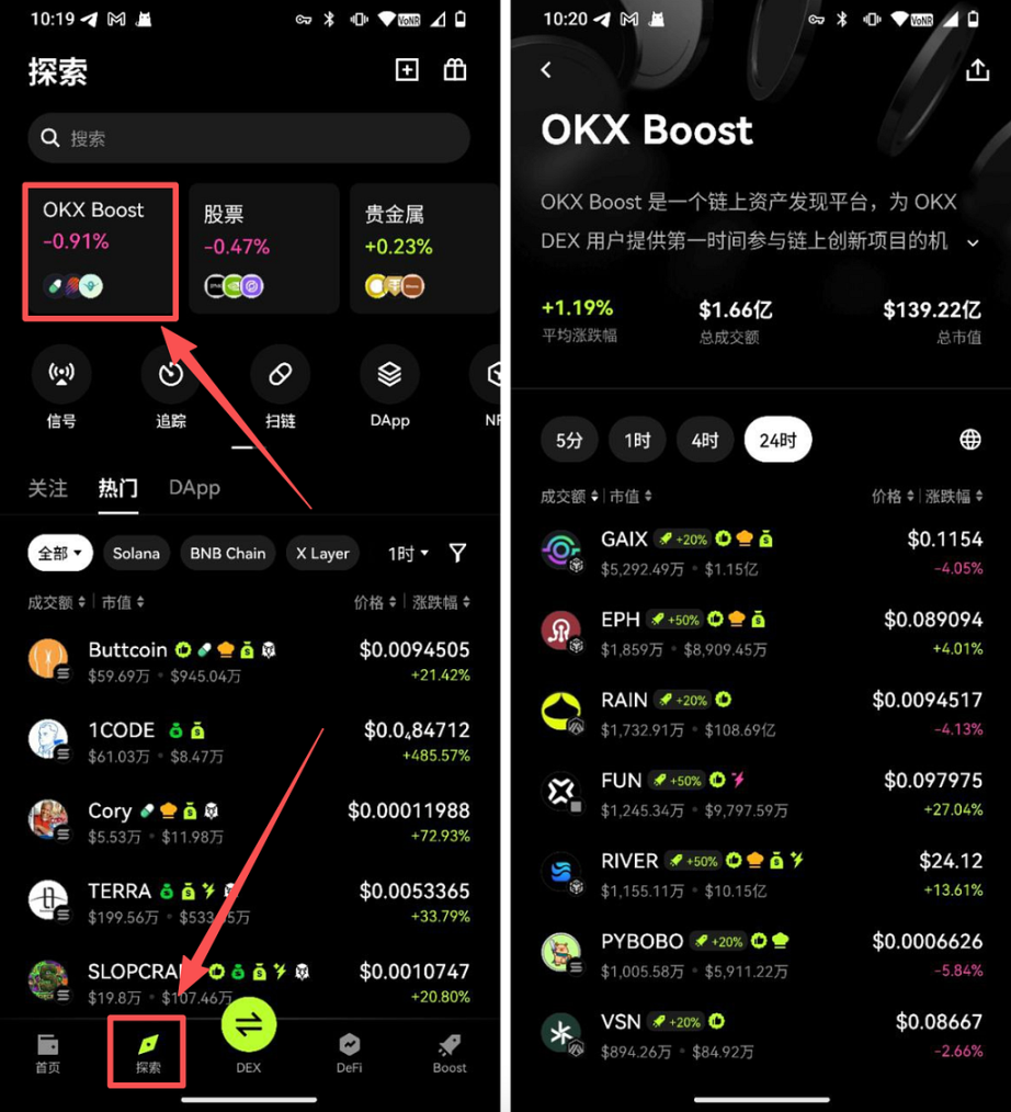 充值完成后,点击“探索”、点击“OKX Boost”、寻找代币进行交易;