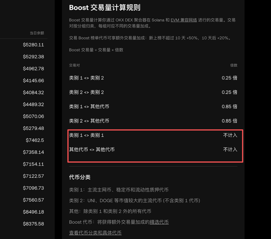 但我们需要注意的是,不要用 USDT 去刷 BTC、ETH、BNB、USDC,这在 OKX Boost 里面被称为 1 类资产与 1 类资产交易,一分都没有;