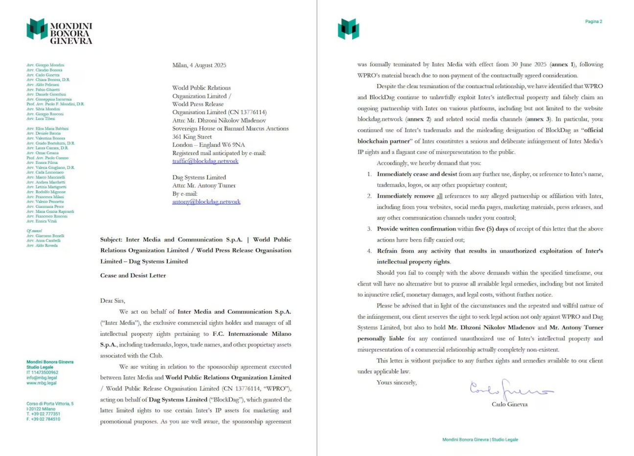 国际米兰媒体公司于 2025 年 8 月发出停止侵权通知函。来源:BlockDAG 投资者