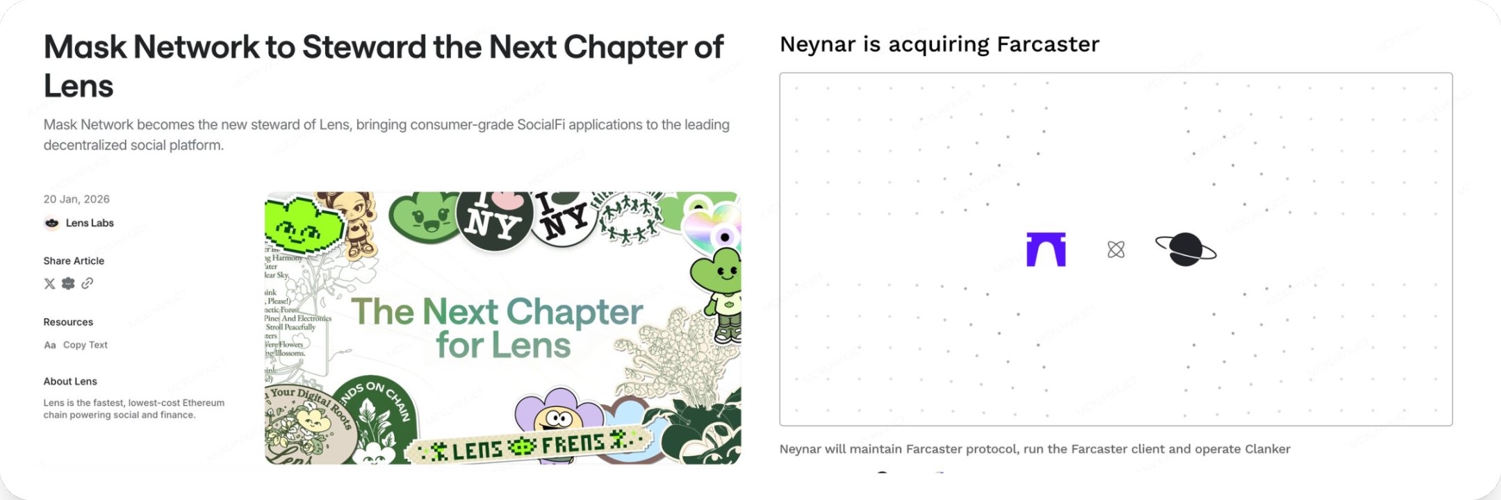 上周,去中心化社交(DeSoc)赛道经历了历史性的结构性震荡,两起标志性的收购案在短短 48 小时内接连落地。先是 Lens Protocol 宣布将管理权移交给 Mask Network,原主导方 Avara(Aave 母公司)选择战略性撤退,创始人 Stani Kulechov 退居顾问一职;紧随其后,Farcaster 宣布被其核心基础设施服务商 Neynar 全资收购,联合创始人 Dan Romero 和 Varun Srinivasan 确认退出,原开发实体 Merkle Manufactory 计划向投资者返还剩余资本。