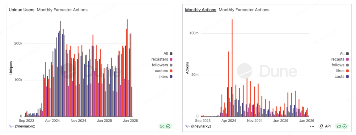 数据揭示了 Farcaster 生态目前面临的严峻“剪刀差”:虽然从用户存量图来看,月活用户数 MAU 在经历 2024 年爆发后看似维持了健康的横盘,并未出现剧烈崩盘。但是结合右侧的月度交互量图表,项目的交互数据在 2024 年 Q2 达到顶峰后呈现出不可逆转的断崖式下跌,2026 年 1 月的数据仅为巅峰时期的零头。这意味着,虽然用户还在,但互动急剧减少了,大量留存用户极有可能是为了空投而保持最低活跃度的“僵尸号”或资产沉淀后的静默账户。