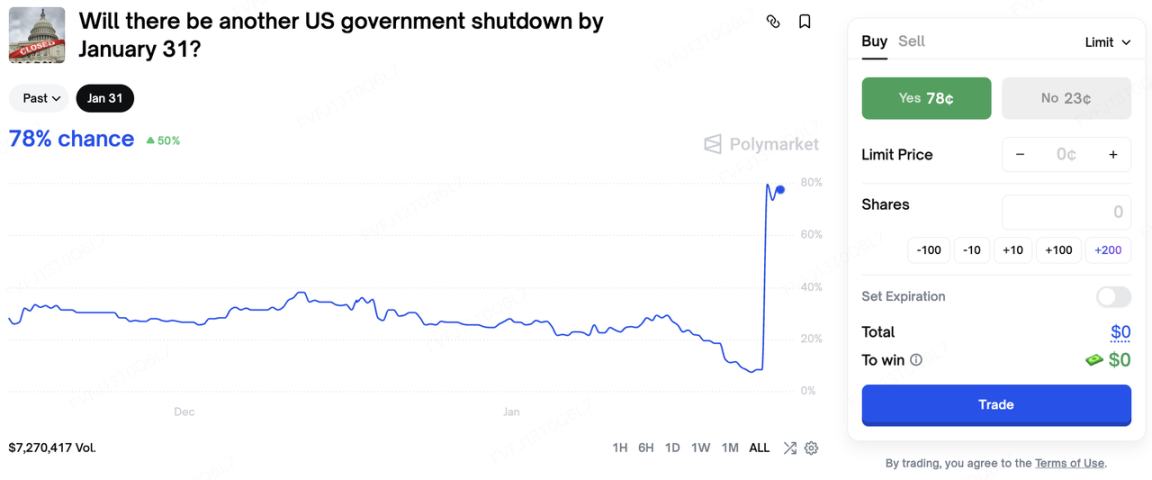 与此同时,美国国内政治不确定性也在抬升波动率:美国明尼苏达州两周内发生第二起联邦执法人员致命枪击案,引爆国会政治僵局,使美国政府月底停摆风险显著上行。Polymarket 数据显示,美国政府在 1 月 31 日前再次关门的概率已飙升至 77%。