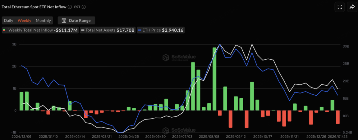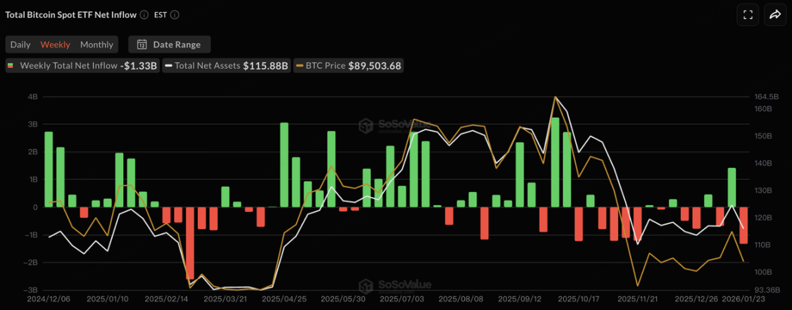 在资金面上,现货 ETF 的流出进一步强化了“去风险”的市场行为。比特币与以太坊现货 ETF 连续多日出现大额净流出:BTC ETF 本周净流出约 $1.33B,其中 1 月 21 日单日净流出达到 7 亿美元;ETH 现货 ETF 也表现疲弱,1 月 20 日至今连续 4 日净流出,最高单日数达约 2.3 亿美元,本周净流出 $611.17M。